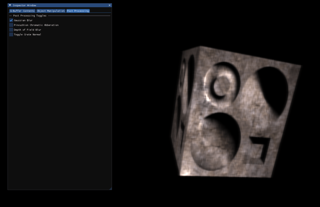 Having a simple GUI (graphical user interface) using ImGui to be able to toggle the different effects made it easy for me to debug and adjust values at runtime to achieve the desired effect. This also means that I can add more effects in the future and still have a clean, navigable interface for users or developers to traverse in order to manipulate the output of the application.