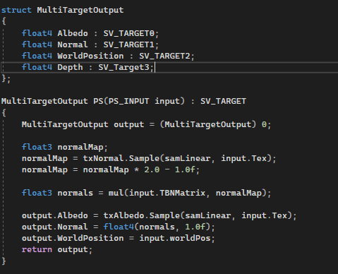 Before undergoing this project I had little to no experience with Multi-Render Target Views (MRTV) with DirectX, but in order to achieve multiple post processing effects, using MRTV’s properly to tidy and clean up the data sent to the GPU and make it easier to read and process meant that outputting from a shader can be done in one uniform struct containing all the data needed.