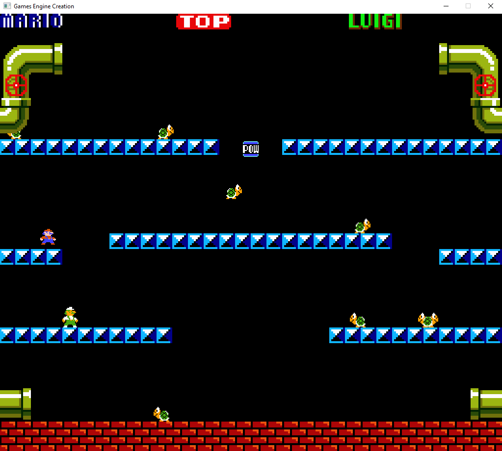 For my Games Engine Creation Module, we were tasked to make the 1983 Mario Bros. to the best of our ability with the tools at hand, this project will be ongoing even after the end of the term, this is because I would like to develop it even further and create more interesting levels to develop my skills with C++. This project has helped me put into practice concepts such as polymorphism, inheritance, abstraction and encapsulation. All of the previously mentioned were vital to not only having a functioning, efficient game, but also clean, readable and adaptable code that can be used in the future to further develop the project without unnecessary errors.